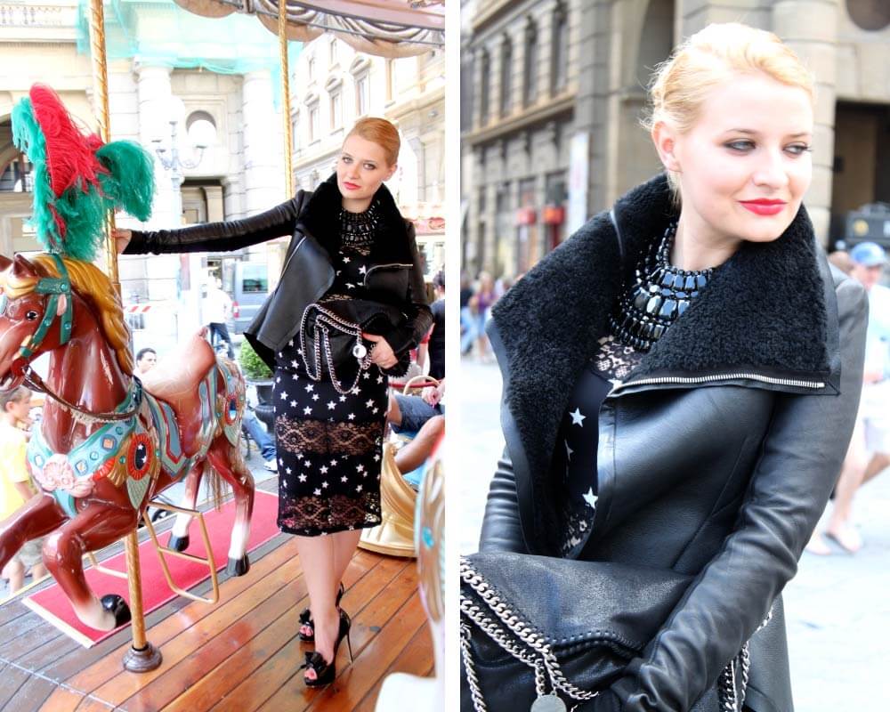 Dress: DOLCE & GABBANAJacket: RICK OWENS – Bag: STELLA MCCARTNEY – Shoes: VALENTINO – Necklace: ALABI CLEOPATRA